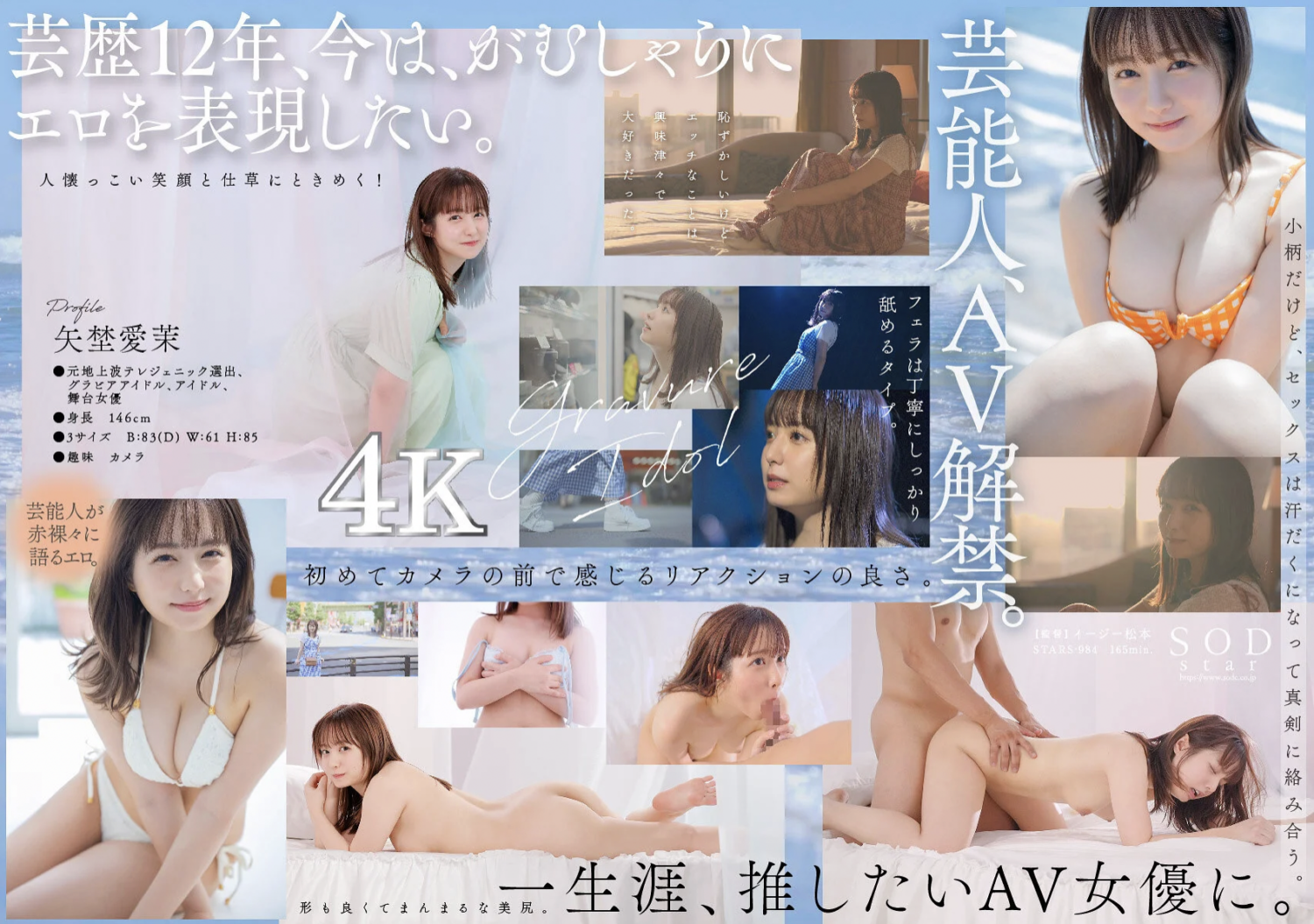 矢埜 愛茉(やの えま)さんは、1996年2月13日生まれのAV女優です。元グラビアアイドル・女優で、日テレジェニック2014選出の経歴を持っています。芸能界で13年活動後、2024年2月にSODstar専属でAVデビュー。